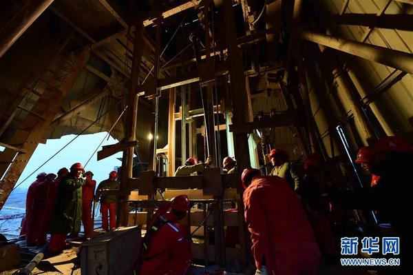 1月5日,救援人员在向井下投放水泵,以抽取矿井中的透水。当日,山东平邑玉荣石膏矿坍塌事故救援进入第12天,由于地质条件较为复杂,大口径救生钻机施工极为困难,5号大口径救生钻孔目前仅掘进50余米。救援难度进一步加大,下一步钻孔过程中的困难也难以预计。新华社记者郭绪雷摄