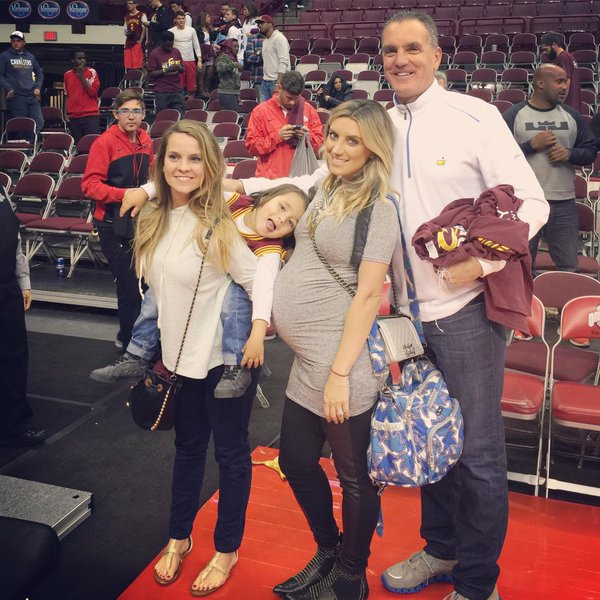 世界闻名的高尔夫球手简森-戴伊(右二)在美国时间17日夜觅得片刻空闲,带着自己的美妻艾丽(右一)来到了速贷球馆,观看骑士对决雷霆的焦点之战。