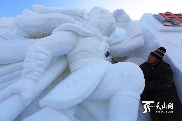 天山网讯(通讯员年磊摄影报道)瑞羊辞岁,金猴迎春。1月6日,在新疆博湖县博斯腾湖大河口(西海渔村)景区,工匠师傅们正在对长18米,宽6米,高6米,用雪量648立方米的巨型雪雕“金猴迎春”进行最后收尾工作,为博湖县第九届冰雪节开幕式做准备。