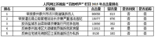 截至2016年1月3日,人民网江苏视窗“百姓呼声”栏目2015年共收到1736条投诉,其中272条获得有关单位回复,回复率为15.67%;17条投诉引起媒体注意,进行了追踪报道;其中,既有回复又有追踪的投诉有3条。