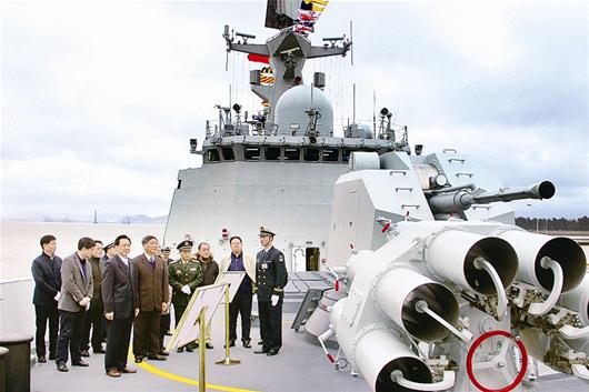这是一艘银灰色的战舰,舰体光滑整洁,呈流线的长艏楼甲板、方尾舰型,简洁而精致。登上荆州舰,记者立刻被军舰上的装备震撼: