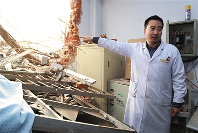 上述两人对新京报记者介绍,事发时,放射科同事正在给病人做检查,突然墙体被挖掘机捅破个大洞,屋内设备被砸坏,医护人员和病人差点被埋,正在接受检查的病人吓得从检查台上鞋子都顾不上穿往外逃。距离放射科一两米的太平间被推毁,6具尸体被埋砖堆下面,至今也没能抬出来。