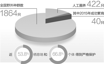 据了解,“十二五”期间,我国大熊猫保护工作成效显著。全国野外大熊猫种群数量达1864只;已建立大熊猫保护区67处,使近53.8%的栖息地和66.8%的野外大熊猫个体得到严格保护。成功解决了人工圈养大熊猫发情难、配种受孕难、育幼成活难等关键技术。积极开展圈养种群野外培训和放归研究,先后放归了“淘淘”“张想”“雪雪”“华娇”4只大熊猫,并形成了大熊猫野化培训梯队,逐步开展野化放归。还陆续与日本、英国、法国、新加坡、加拿大、马来西亚、比利时7个国家开展了大熊猫国际合作研究项目,开展大熊猫国际合作的国家达12个。