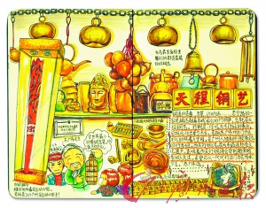 不久前,80后“草根画家”龚婷的“青春印记·广州情怀”漫画展在熙熙攘攘的北京路举行。这位年轻插画家所创作的四幅漫画,分为广州童谣、广州方言俚语、广州地标、北京路文化古迹四个系列,其中一张小小的漫画竟然藏着60多个方言俚语。《花阶砖》是其中最吸引游客注意的一幅——“旧时每家每户都有花阶砖,我觉得他们就像花海一样漂亮,所以我最喜欢打地铺,感觉就像在花海中”,作者给每幅漫画都配上了承载自己真实感受的文字说明。对于不少自小在广州成长的人来说,看到记忆中的场景重现在眼前,会有一种感动油然而生。这是属于龚婷自己的回忆,也是一代人共同的记忆。