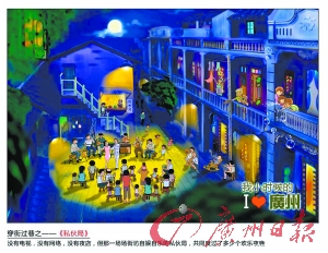 在“我小时候的广州”作品系列里,体现的都是龚婷小时候的真实生活场景。令她印象最深的场景就是以前家家户户夜不关门,夜晚开着趟栊,全街街坊坐在巷子里,谈天说地,私伙局乐声悦耳,不时还有街坊拿着煲好的老火靓汤,喊着:“莲藕煲猪■,要不要来一点?”整个巷子家家户户就像一家人。作为一名“老广”,她觉得自己的每幅画都能代表广州的独特风格,“那种人文色彩和街坊感情是无法替代的,我想表达的并非某个景物,并非某些场景,我在表达的是广州人那份纯朴的街坊情。”她说。
