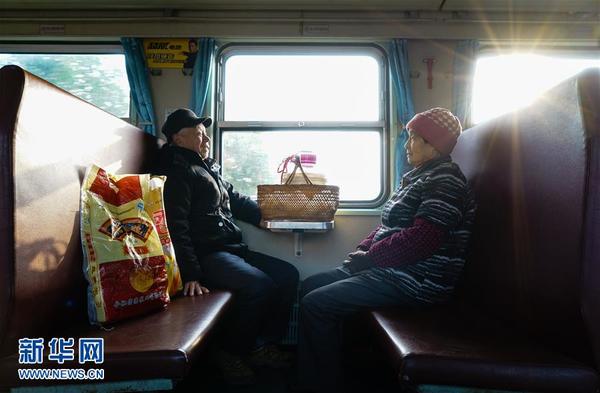 1月8日,在7101次列车内邂逅的两名老人在聊天。新华社记者 李响 摄