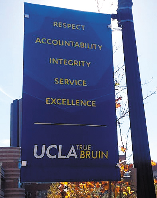 我有一个爱好,就是喜欢逛知名大学。在过去的这十几年里,我到过二三十所世界一流大学。去年下半年,时值我学术休假在美国访学,11月下旬的一天,秋高气爽,我来到加利福尼亚大学洛杉矶分校。看到校园里有不少彩色的旗帜,上面写着代表其教育理念的言辞,而这在其他大学则很少看到。