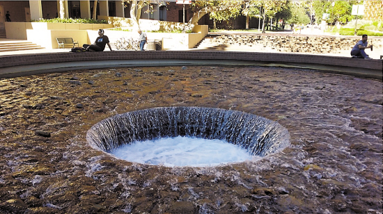 加利福尼亚大学洛杉矶分校的校园里,有一个大水池(图一),它看上去很特别,因为人们见得最多的是“喷水池”,而这个则是“吸水池”,这是根据物理学中的“宇宙黑洞”概念而建造的。这种把抽象的科学概念变成校园的艺术装饰,让学生在潜移默化中领略科学的审美价值,由此可见学校管理者的匠心。