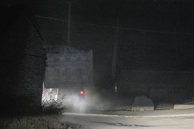 其中一辆货车沿矿山路驶出,到达十百户村村口对面的存料场。