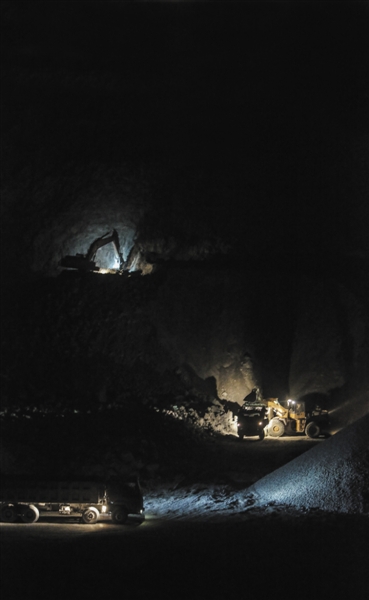 2015年12月27日晚9点,河北省三河市东部矿区,两侧山岭上灯光闪烁,挖掘机的杵子(钻头)一下下钻进山体,沿路一辆接一辆的大卡车,满载着石料扬长而去。