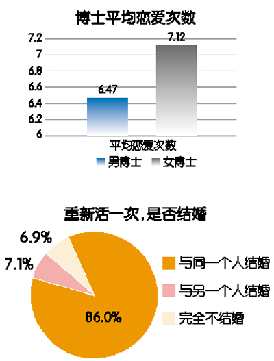 一说到博士,总给人一种眼镜片厚如玻璃瓶底,奔命在实验室和论文堆之间的印象。但是,今年通过对不同受教育程度人群的恋爱经历调查发现,博士群体在恋爱中的表现令人大跌眼镜。从综合恋爱次数上来看,博士高居榜首。调查显示,博士的平均恋爱次数是6.87次,高居第一。从数据上来看,一个本科生谈一次恋爱的时候,博士已经谈完两次,正在酝酿第三次了……更让人意想不到的是,在博士中,常被人们调侃的女博士的恋爱次数更高,平均为7.12次,男博士居然在恋爱次数上拖了女博士的后腿。