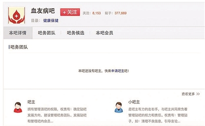 昨天中午,北青报记者搜索“血友病吧”,发现账号为“血友病专家”的用户成了大吧主。在一则“姗姗来迟 不好意思”的声明中,该吧主表示,他们“受百度公司委托管理该吧”,并称“百度收回贴吧进行统一管理,是大势所趋,望吧内血友冷静理性对待”。