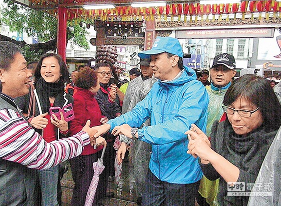 11日,国民党候选人朱立伦(中)一进丰原慈济宫庙埕,便受到支持者的热烈欢迎。(记者王文吉摄)图片来源:台湾《中时电子报》