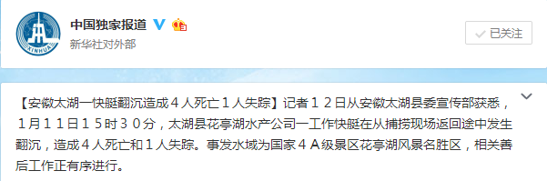 安徽太湖县花亭湖一快艇翻沉 造成4人死亡1人失踪