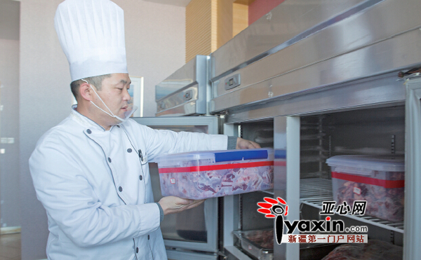 走进房间,周边摆放着新购置的冷藏室和冷冻室,其中储存着近一吨的牛羊肉,中间货架上整齐地摆放着十多个保鲜盒,里面放着梨、苹果等新鲜水果,还有鸡蛋、牛奶等,这些食材都是由组委会集中采购的。