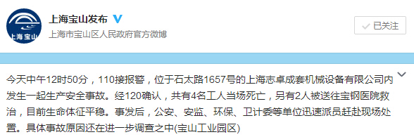 人民网北京1月13日电 据上海市宝山区人民政府官方微博消息,今天中午12时50分,110接报警,位于石太路1657号的上海志卓成套机械设备有限公司内发生一起生产安全事故。经120确认,共有4名工人当场死亡,另有2人被送往宝钢医院救治,目前生命体征平稳。