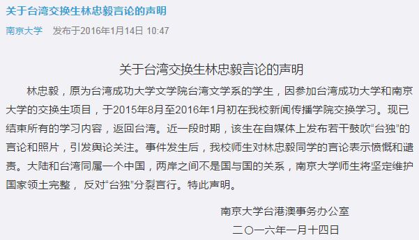 1月14日,南京大学在其官方微博发出声明,称曾在该校学习、已返回台湾的台湾成功大学交换生林忠毅近来在自媒体上发布鼓吹“台独”的言论和照片,“我校师生对其言论表示愤慨和谴责。”