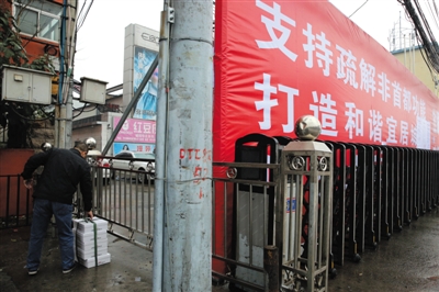 2015年11月20日,原大红门方仕鞋城已基本搬迁完毕,市场周围立起围挡,送货的人已无法进入。 新京报记者 李飞 摄