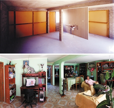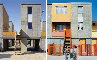 2004年金塔蒙罗伊住宅项目。左图是“半成品房子”,右图是居民自己动手完善后的房子。