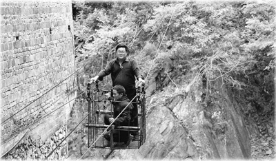 宣汉县龙泉乡高架村第一书记蒲国林(站立者)乘简易索道到1组走访贫困户。