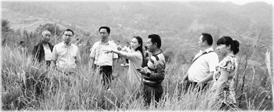 达州经开区斌郎乡何家村第一书记杨晶方(右四)一行为新建堰塘选址。