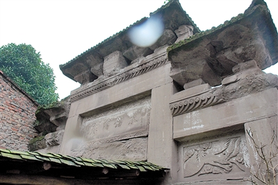 进入八庙场,最吸引记者眼球的,就是那座四柱三门三滴水双重檐仿木结构的石牌坊。如今,石牌坊的主门已经被条石封堵,旁边的一个侧门成了一家居民的后门。从此门进入,才能够看到牌坊上保存完好的诸多细节——正中的额枋上刻有“永锡鸿庥”四字,上款为“乾隆乙卯(1795年)季冬吉旦”,证明了此牌坊至少有两百多年的历史了。落款为“巴邑学生熊文元建”,左右两边还有浮雕的麒麟与凤凰图案。