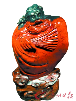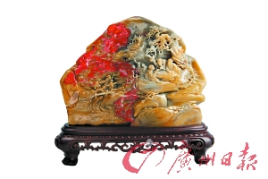同时,由于其底色多样,特别适合做俏色巧雕。譬如这次展出的《钟馗像》,红黑相间,就很有感染力。原石本身纹理多变,也具有奇石的观赏价值,有的看起来就像桂林的梯田地貌,有的则呈现出国画味道,像山水小品。