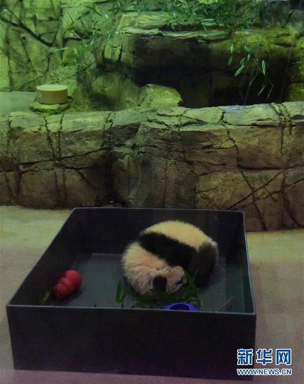 1月16日,“贝贝”在动物园睡觉。当日,在美国首都华盛顿国家动物园,大熊猫幼崽“贝贝”第一次与公众见面。 新华网记者 鲍丹丹 摄