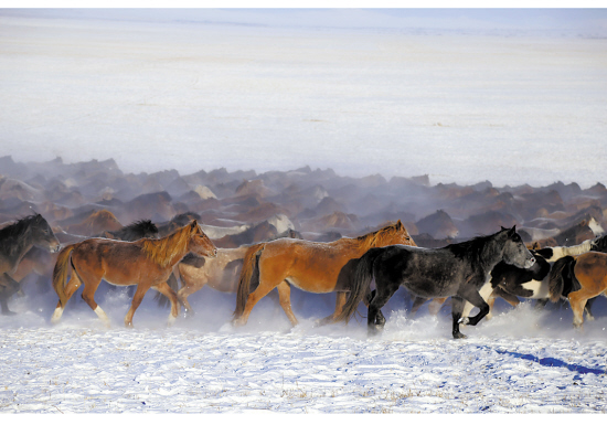 对于摄影发烧友而言,能深入草原腹地拍摄马群奔腾的壮观场景,一定是值得骄傲的极致体验。这一天早晨,我们便行驶在一望无际的呼伦贝尔陈巴尔虎旗哈达图一带草原中,穿越上百公里苦寻蒙古马群。直到临近中午,才在天际边出现了清晰的黑线条,不一会儿,足有上千匹马匹如泉涌般直冲入我们的视线,马蹄扬起阵阵雪灰,呈现出令人震撼的壮观景象,仿佛置身沙场。值得注意的是,只有在草原积雪不厚的情况下,车辆才可通过,并且必须要有当地牧民做向导,不可贸然进入无任何参照物的冰雪草原中,切不可驱车靠近马群。