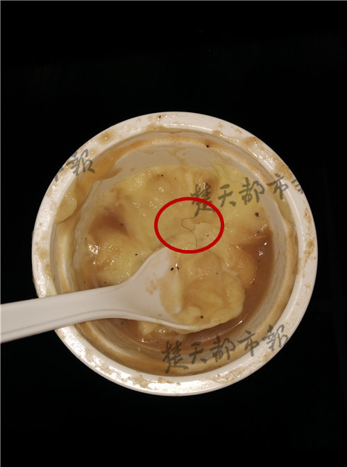 在韩小姐吃了一半的土豆泥中,记者看到这个毛发相当卷曲,长约2厘米,带有毛囊,颇细。