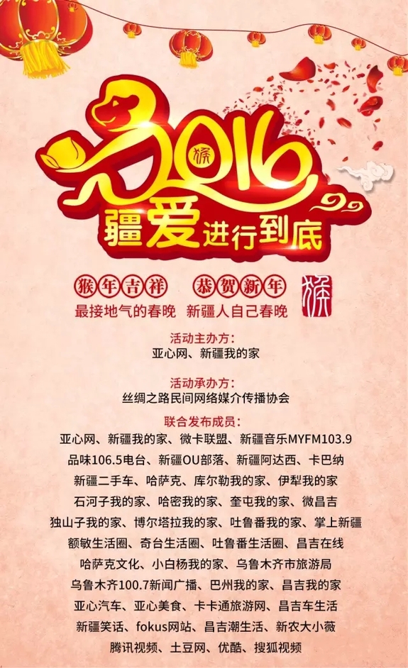 亚心网讯(记者 闫小芳)2016第五届新疆网络春晚暨新疆首届新媒体网络春晚已经震撼开播,在这场全疆网民的狂欢PARTY到来之际,最让人关注的第一波节目终于曝光,这让诸多网友大呼又“惊”又“喜”,“惊”的是本次网络春晚采用的多种高科技手段远远超越期望值,让人们激动:原来如今的春晚还可以这样办!而让人“喜”的是,此次网络春晚饱含让人点赞的诚意,几乎将各类网友、各年龄层的观众都考虑到了,这是一场“网络春晚”,更是一场全民都可以观看、娱乐、参与的春晚。