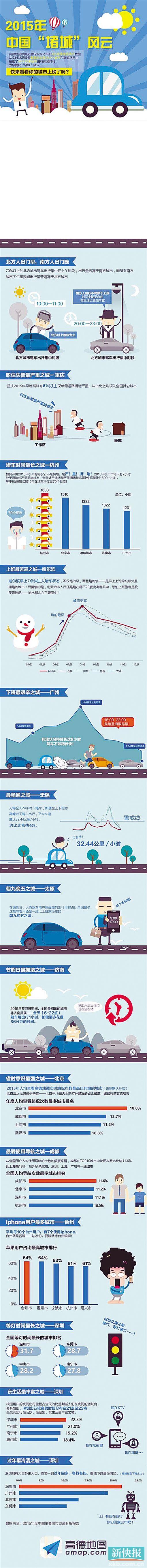 通过对近两年的历史数据分析,高德还预计2016年大部分城市最拥堵的月份将集中在11月和12月。而全年中,“十一”国庆节的前一天(9月30日),当天出行集中且恰逢周五,将会是2016年大部分城市最拥堵的一天。![]()