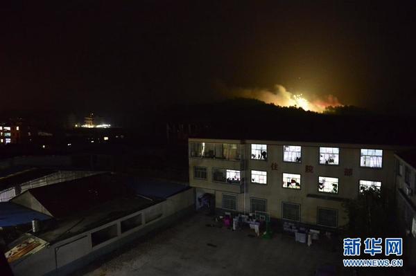 上饶(江西),2016年1月20日 江西上饶市广丰区发生一起花炮厂爆燃事故 1月20日,在距离爆炸现场约1公里的一处医院,可以看到花炮厂里仍然有烟花不断引燃。当日0时30分左右,江西上饶市广丰区洋口镇昆山村发生一起花炮厂爆燃事故。 新华社记者周密摄