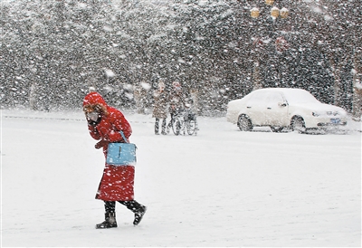 1月19日,市民在山东省烟台市毓璜顶东路冒雪出行。