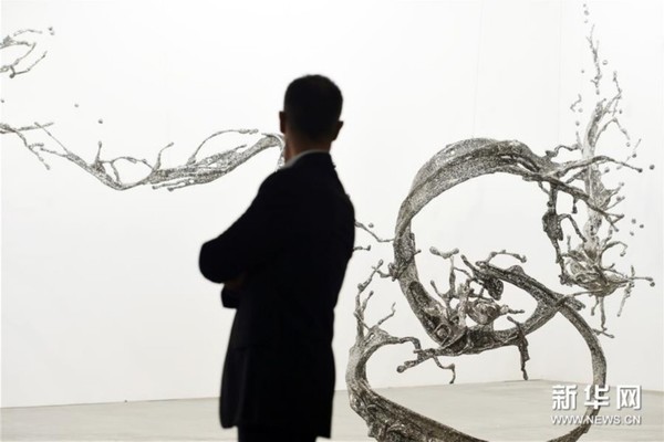 1月20日,在新加坡滨海湾金沙展览中心,一名参观者在“艺术登陆新加坡”预展上观赏艺术作品。“艺术登陆新加坡”展览将于21日正式开展。新华社发(邓智炜摄)