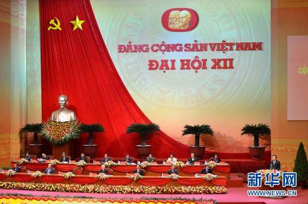 1月21日,在河内举行的越共十二大会议现场。当日,越南共产党第十二次全国代表大会在首都河内国家会议中心正式开幕。越共十二大于1月20日至28日在河内召开,届时将选出新一届中央委员会,并在此基础上选出包括越共中央总书记、中央政治局委员等在内的越共新一届领导层。代表越南450多万名党员的1510名代表出席会议。新华网记者闫建华摄