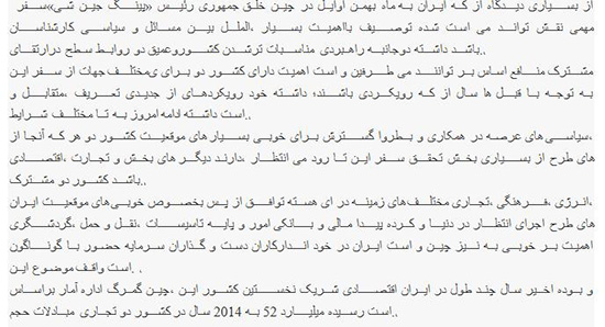 作为在国际秩序中具有影响力的两个独立国家,伊朗和中国的友好往来有着悠久的历史,双方在友好合作不断发展的过程中也有共同的利益和目标。许多国际政治问题观察家认为,习近平主席本月对伊朗的访问对加强两国关系具有非常重要的意义。双方将在相互尊重、平等互利基础上讨论与各自利益相关及共同关心的问题。在政治、经济、商贸和其他领域中,中伊两国亦存在着许多深化关系加强合作的良好机遇。各方期待,两国能借助此访推进双方在多个领域的合作。