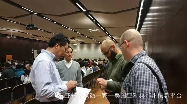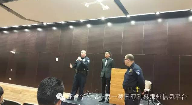 此后,与会者就案件的进一步调查、枪支控制、药品控制、安全防范等纷纷提问,Johnson 警长、ASU警长、ASU中国学生学者联谊会主席朱博威认真诚恳地做出了解答。Johnson警长说,你们是国际学生,但是我们从来没有把你们当做外人,你们就是这个社区的一部分,你们是我们的一部分,我们是你们的一部分,我们一起来讨论行动,一起来建设这个社区。Johnson警长的肺腑之言赢得了热烈的掌声。