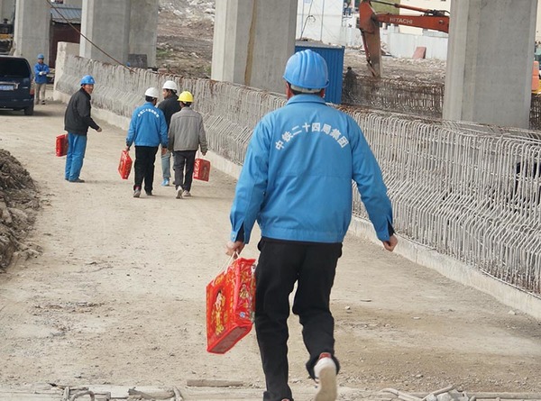 人民网上海1月21日电 (唐小丽)一年一度的春节临近,又到了大包小包回家过年的时候。1月20日下午,在嘉闵高架的施工现场,记者看到中铁二十四局上海公司的工人们正在领取公司发放的春节大礼包。