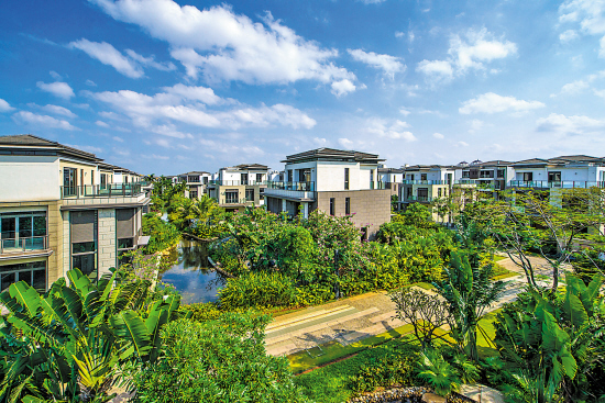 由于临海,恒大在社区内打造30万平方米的内海循环系统,引入外部海水,打造环绕社区的活水循环系统,并巧妙结合热带园林的高低起伏,摈弃机电运作,利用纯生态潮汐起伏,让水系自由贯穿各个组团间,形成可智能调节温度的小气候与室内外交融的生活环境,从而减少空调的使用,为居住者提供一个“会调养的社区”、“懂养生”的房子与充分尊重可持续发展的健康颐养空间。