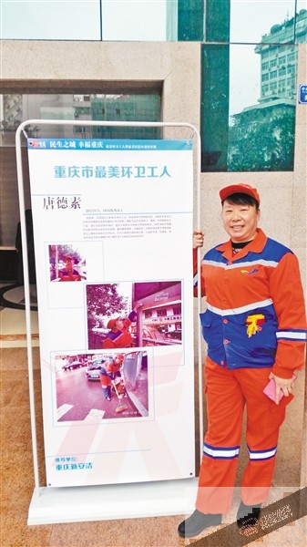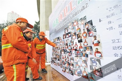 “莫害羞,来,给你和个人拍张照!”在工友的怂恿下,金忠伟磨蹭半天,才不好意思地站在展牌旁边,“你看嘛,还是穿起环卫工衣服的我要好看些!”