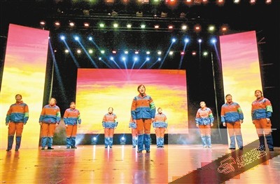 昨晚,10名环卫工人合唱民歌《太阳出来喜洋洋》,赢得观众阵阵掌声。 本报记者 雷键 李斌 摄