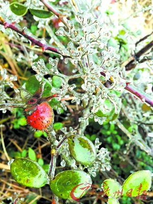 被冰雪封冻的金樱子。记者卜瑜 摄