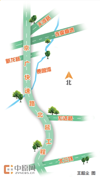 京广快速路二期北延工程,南起北三环现状京广快速路高架桥,向北依次经京广铁路、宏达路、贾鲁河、新龙路,跨越连霍高速后,与天河路相交,于石苏路口北侧落地。二期北延工程全长约4.48公里,采用“高架+地面道路”形式。高架桥宽25.5米,双向6车道,分别在三全路北侧、宏达路北侧等设上下平行匝道。地面道路主路设置双向8车道,两侧分别有3米宽的人行道和5米宽的非机动车道。