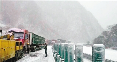 本报讯 22日的一场大雪,致使包茂高速西镇段积雪严重。昨晚9时,记者了解到,此路段因雪已经双向管制,过往的车辆需择路分流。