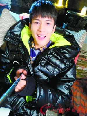 韩东君一身羽绒服玩自拍。