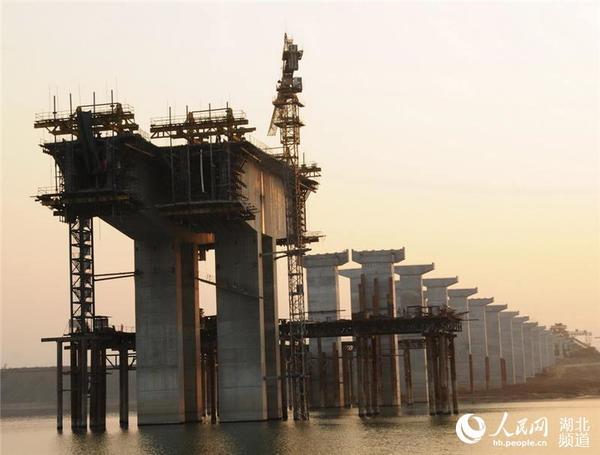 人民网十堰1月25日电 1月25日,技术工人正在湖北省十堰市郧阳区沧浪洲汉江大桥工地加快施工建设,郧阳沧浪洲汉江大桥全长1785米,宽26米,双向六车道。其中大桥与连接线总长为3.15公里,工期为36个月,总投资为5.1亿元,其中大桥投资4亿元,目前大桥建设进入T梁吊装和主桥跨整体浇筑阶段。(周家山 摄)