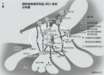 建设城市风道就是通过在城市规划中引入气候规划,保证城市主风道的畅通,把郊区的风引进市区,增加城区空气流动,促进大气良性循环。这样有助于缓解西安夏季高温,也能吹散城市上空的空气污染物,削减城市雾霾的影响,并向城市输送新鲜空气。薛立尧说,考虑到通过规划有形空间,疏导构建无形的通风体系,课题组建议,西安采取“风道+景区”的建设模式,也可简称为“风道景区”建设。这样可以把城市无形系统中的风和有形系统中的景区结合起来,既为城市风道体系建设寻找到有效突破口,也可以促进宜居城市建设。