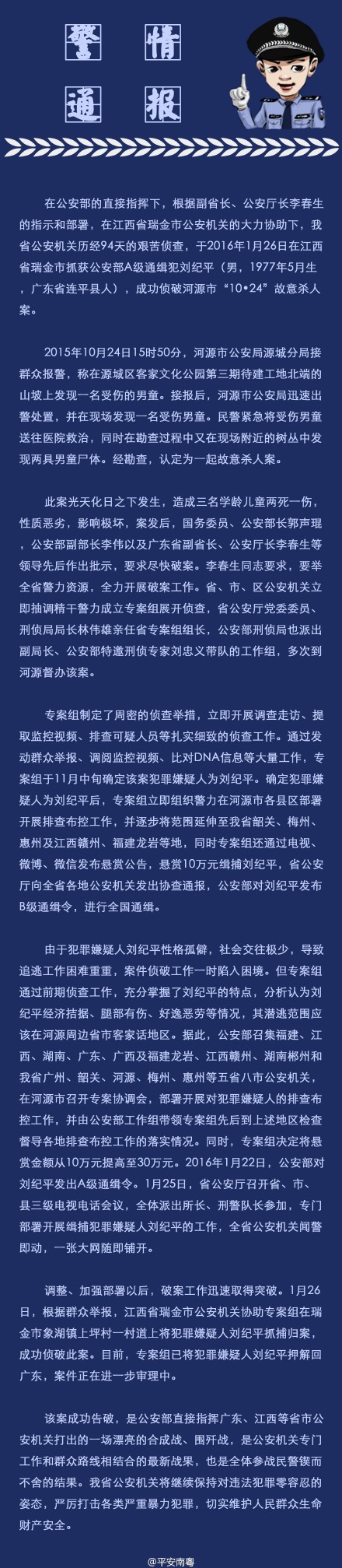 @平安南粤【杀人通缉犯刘纪平落网 举报群众现场领取30万元奖励】1月26日,公安部A级通缉犯刘纪平在江西省瑞金市被抓获,广东省公安机关成功侦破河源“10•24”杀人案