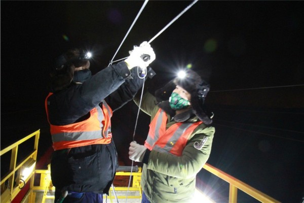 现场作业人员帽子上的头灯和接触网照明灯,映射到作业平台上亮如白昼,远远望去宛若夜空中的星星落入旷野。王冰摄